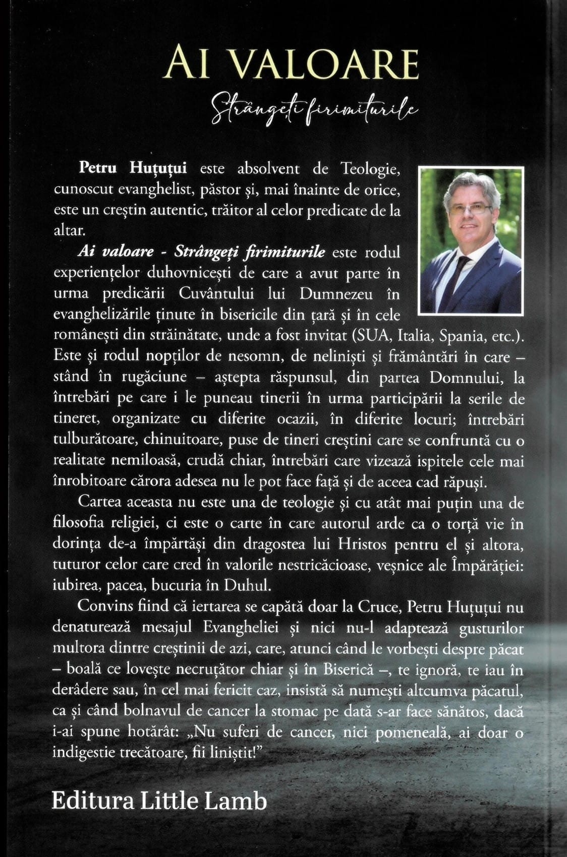 Convins că iertarea se capătă doar la Cruce, Petru Huțuțui nu denaturează mesajul Evangheliei și nici nu-l adaptează gusturilor multora dintre creștinii de azi, care, atunci când le vorbești despre păcat – boală ce lovește necruțător chiar și în biserică -, te ignoră, te iau în derâdere sau, în cel mai fericit caz, insistă să numești altcumva păcatul, ca și când bolnavul de cancer la stomac pe dată s-ar face sănătos, dacă i-ai spune hotărât: „Nu suferi de cancer, nici pomeneală, ai doar o indigestie trecătoare, fii liniștit!”