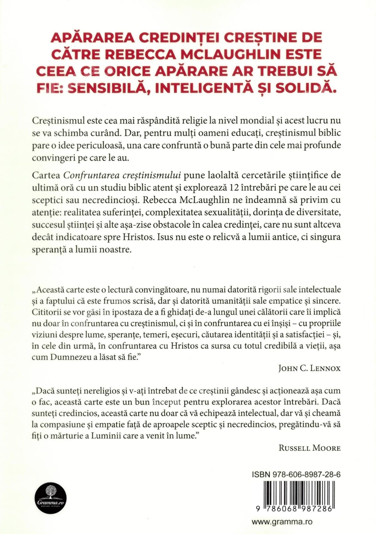 Cartea „Confruntarea creștinismului” pune laolaltă cercetările științifice de ultimă oră cu un studiu biblic atent și explorează 12 întrebări pe care le au cei sceptici sau necredincioși. Rebecca McLaughlin ne îndeamnă să privim cu atenție: realitatea suferinței, complexitatea sexualității, dorința de diversitate, succesul științei și alte așa-zise obstacole în calea credinței, care nu sunt altceva decât indicatoare spre Hristos. Isus nu este o relicvă a lumii antice, ci singura speranță a lumii noastre.
