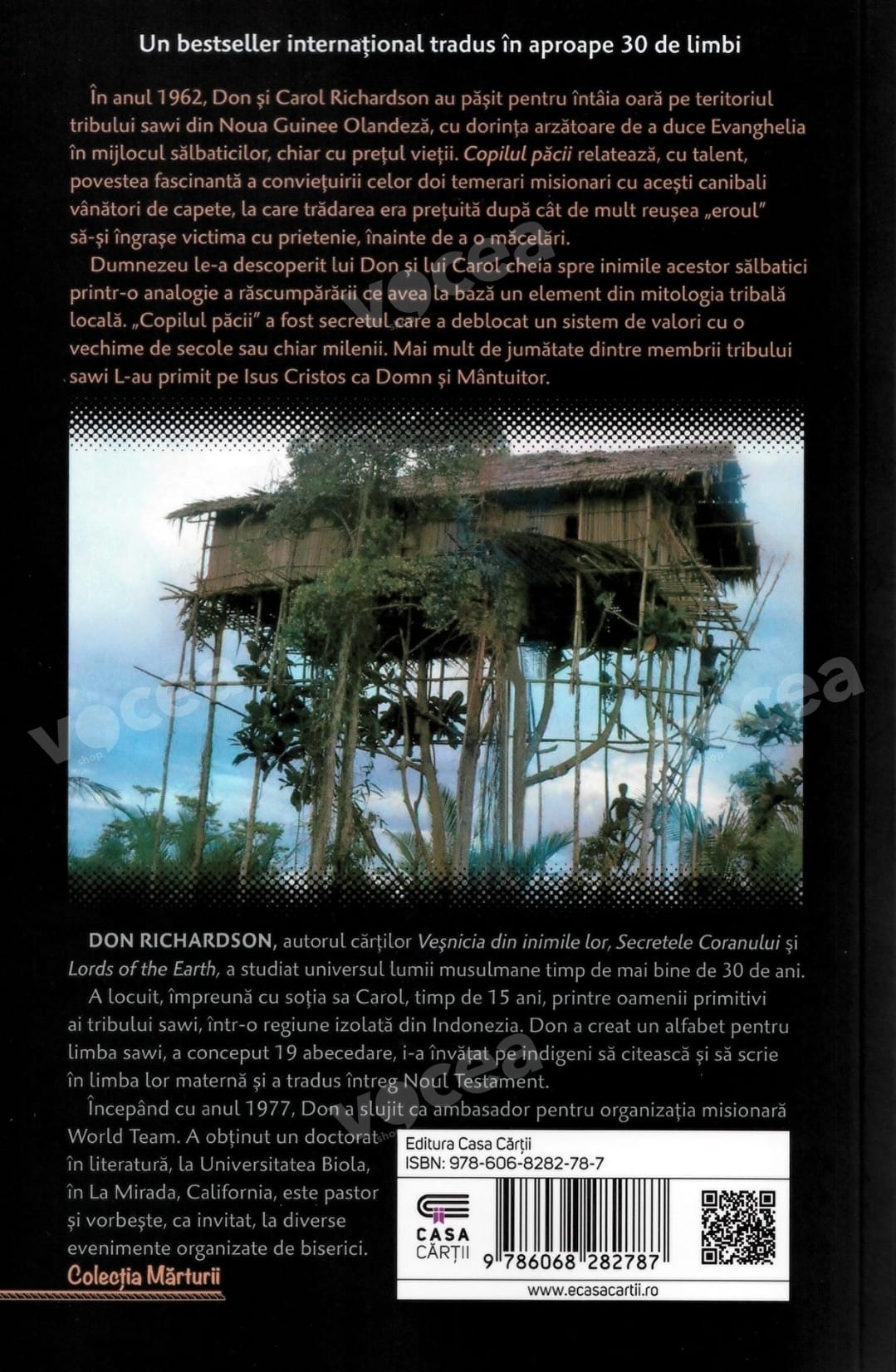 In anul 1962, Don si Carol Richardson au pasit pentru intaia oara pe teritoriul tribului sawi din Noua Guinee Olandeza, cu dorinta arzatoare de a duce Evanghelia in mijlocul salbaticilor, chiar cu pretul vietii. Copilul pacii relateaza, cu talent, povestea fascinanta a convietuirii celor doi temerari misionari cu acesti canibali vanatori de capete, la care tradarea era pretuita dupa cat de mult reusea “eroul” sa-si ingrase victima cu prietenie, inainte de a o macelari.