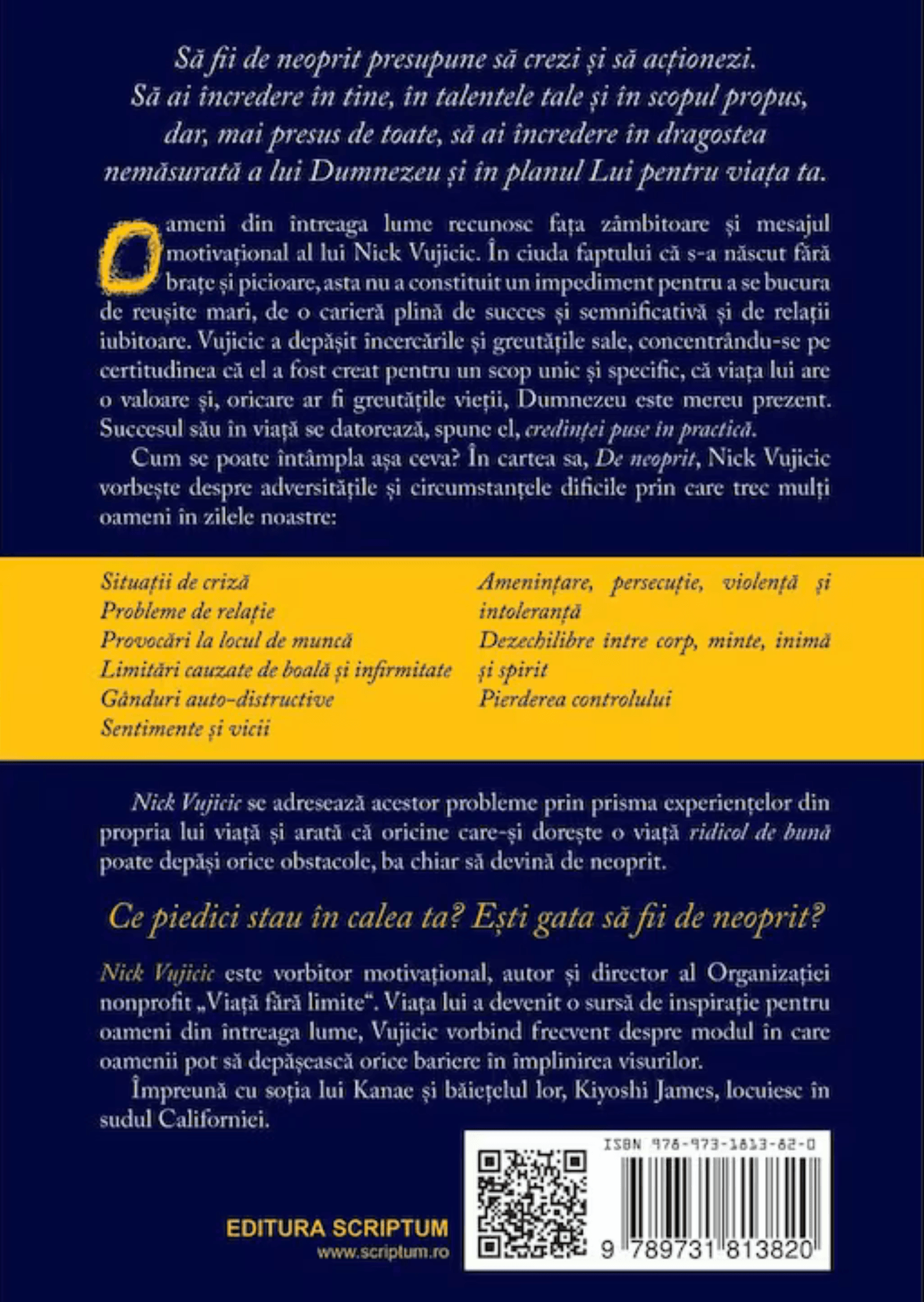 În cartea sa, De neoprit, Nick Vujicic vorbește despre adversitățile și circumstanțele dificile prin care trec mulți oameni în zilele noastre: