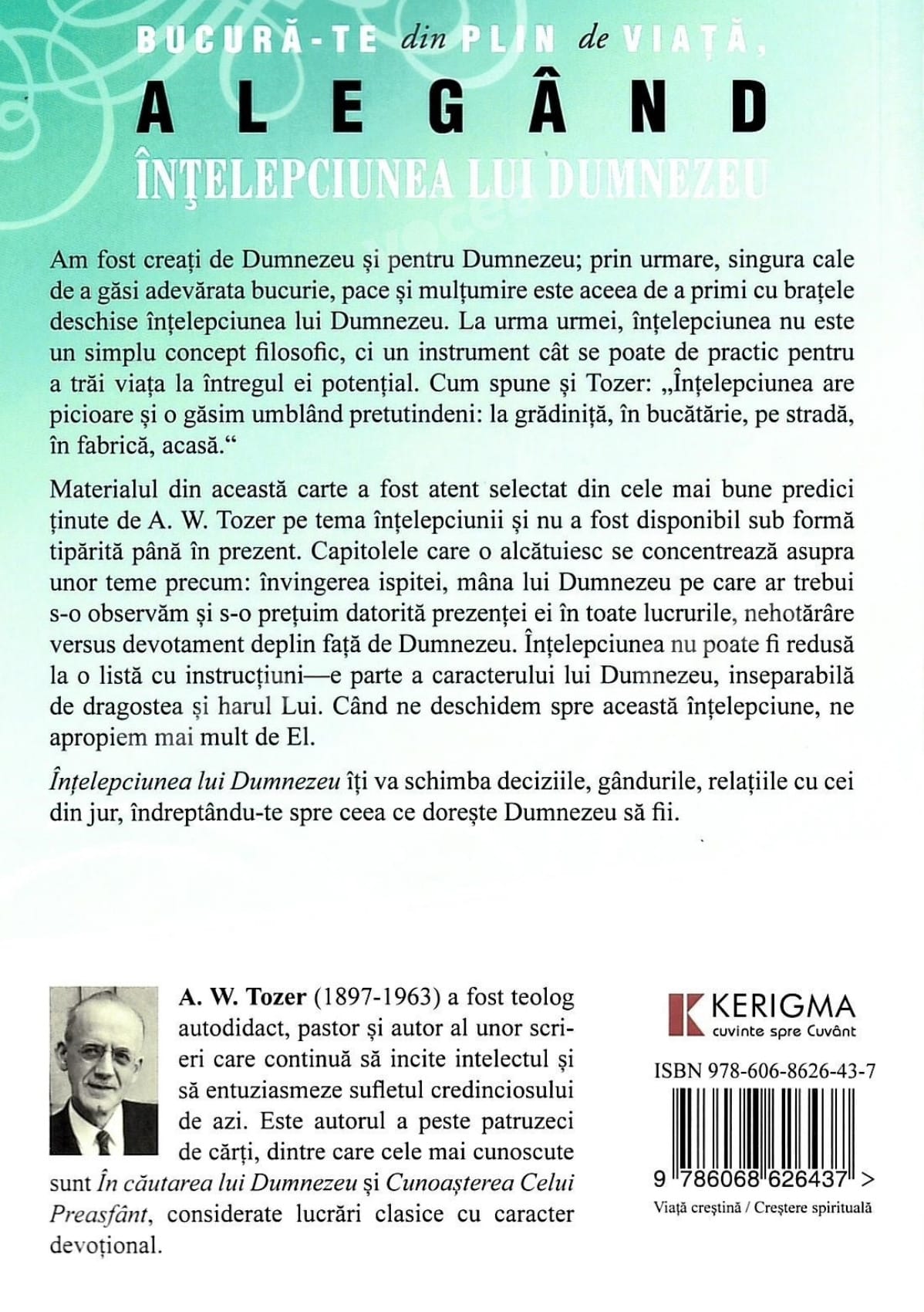 Materialul din această carte a fost atent selectat din cele mai bune predici ținute de A. W. Tozer pe tema înțelepciunii și nu a fost disponibil sub formă tipărită până în prezent. Capitolele care o alcătuiesc se concentrează asupra unor teme precum: învingerea ispitei, mâna lui Dumnezeu pe care ar trebui s-o observăm și s-o prețuim datorită prezenței ei în toate lucrurile, nehotărâre versus devotament deplin față de Dumnezeu. Înțelepciunea nu poate fi redusă la o listă cu instrucțiuni—e parte a caracterului lui Dumnezeu, inseparabilă de dragostea și harul Lui. Când ne deschidem spre această înțelepciune, ne apropiem mai mult de El.