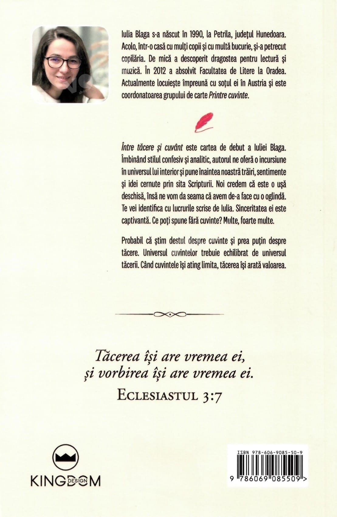 Între tăcere și cuvânt este cartea de debut a Iuliei Blaga. Îmbinând stilul confesiv și analitic, autorul ne oferă o incursiune în universul lui interior și pune înaintea noastră trăiri, sentimente și idei cernute prin sita Scripturii. Noi credem că este o ușă deschisă, însă ne vom da seama că avem de-a face cu o oglindă. Te vei identifica cu lucrurile scrise de Iulia. Sinceritatea ei este captivantă. Ce poți spune fără cuvinte? Multe, foarte multe. Probabil că știm destul despre cuvinte și prea puțin despre tăcere. Universul cuvintelor trebuie echilibrat de universul tăcerii. Când cuvintele își ating limita, tăcerea își arată valoarea.
