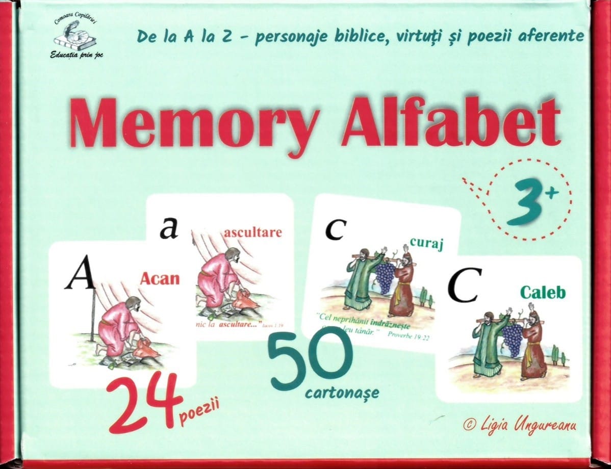 Cele 50 de cartonașe vin în ajutorul copilului pentru a învăța literele alfabetului prin asociere cu personaje Biblice și virtuțile aferente + versete. Pentru a internaliza atât povestirile cât și virtuțile, ai 24 de poezii menite să eficientizeze procesul învățării.